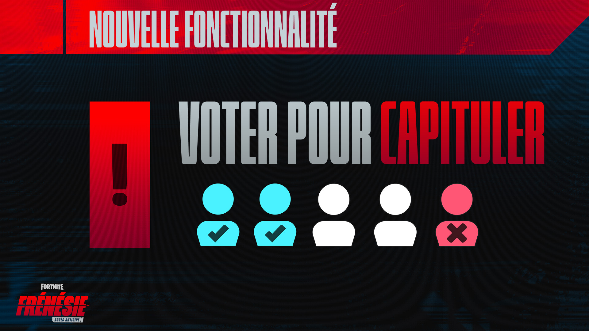 Par ailleurs, nous avons ajouté la possibilité de capituler. N'importe quel joueur peut lancer un vote de capitulation après la troisième manche d'une partie. Pour ce faire, il suffit d'ouvrir le tableau des scores et de cliquer sur le bouton de capitulation. Au début de la manche suivante, l'équipe de ce joueur verra alors le vote apparaître ; la partie prendra fin si la majorité vote en faveur de la capitulation. Dans Frénésie classé, l'équipe qui capitule est déclarée perdante et le rang de ses joueurs régresse.