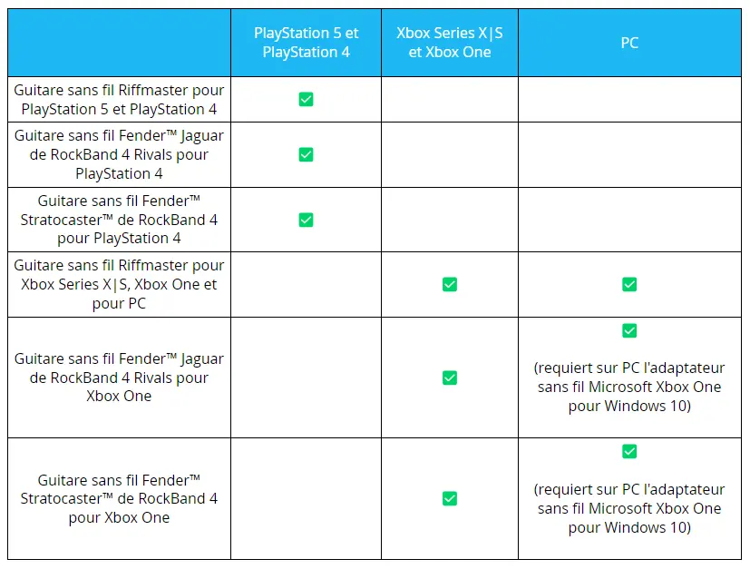 Vous pouvez désormais utiliser les guitares de Rock Band 4 si vous souhaitez maîtriser les partitions de l'instrument principal pro et de la basse pro sur la scène principale sur PlayStation, Xbox et PC ! Consultez le tableau ci-dessous pour savoir si votre manette est compatible au lancement de la saison 3.