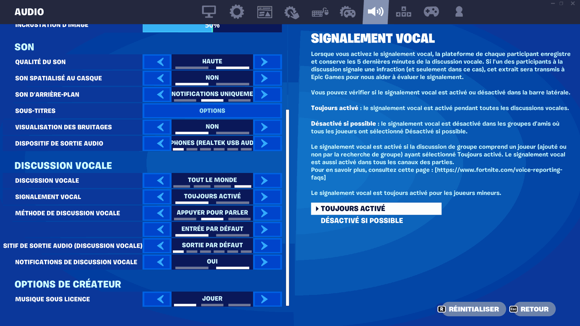 Si vous avez 18 ans ou plus, vous pouvez personnaliser vos préférences de signalement vocal dans la page des paramètres de Fortnite (Son > Signalement vocal > sélectionnez Toujours activé ou Désactivé si possible).