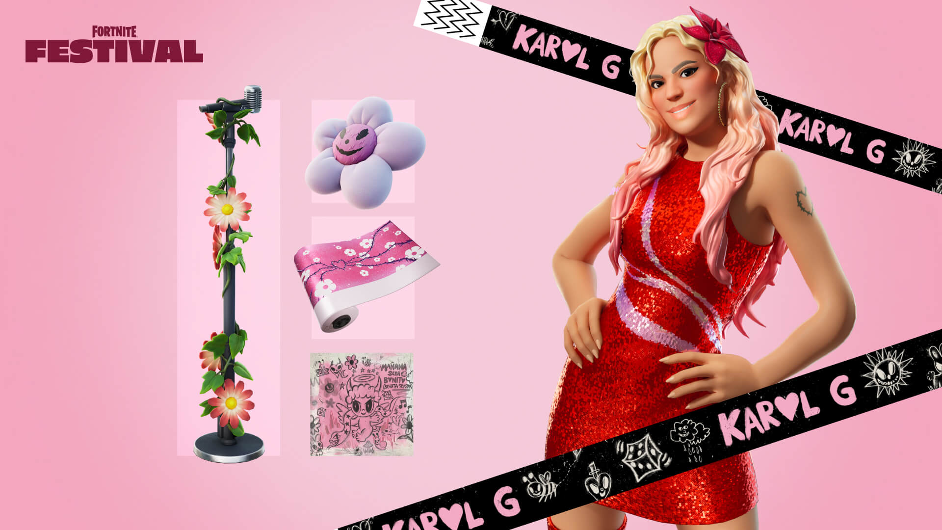 Vous cherchez des objets souvenirs de Karol G ? Avec des fleurs, du rose et des paillettes ? C'est possible, grâce à la voie bonus disponible pour 1 800 V-bucks, vous déverrouillez de nombreux objets cosmétiques de Karol G et des récompenses ! Aucune quête supplémentaire n'est nécessaire pour déverrouiller tous ces éléments.