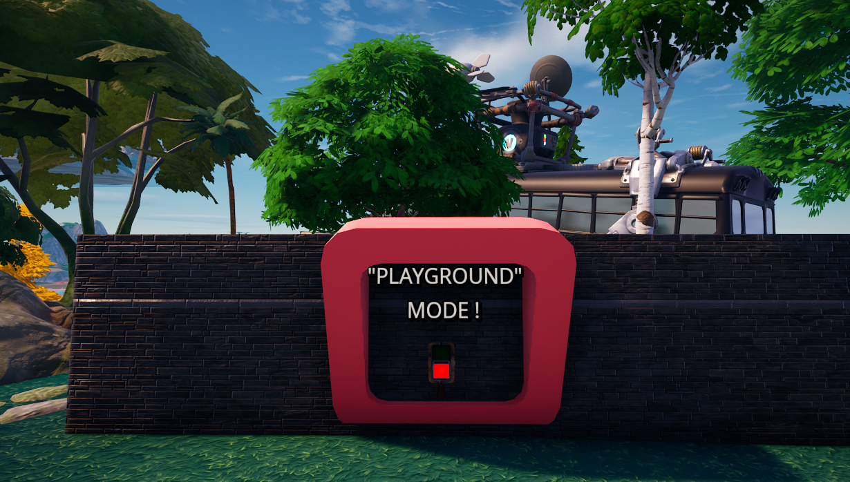 Sur l'île de départ, à côté du relanceur d'île (avec notre île Greasy Sniper One Shot), se trouvera une petite case / un petit emplacement ou vous pourrez interagir avec un bouton qui activera le mode Terrain de Jeu.