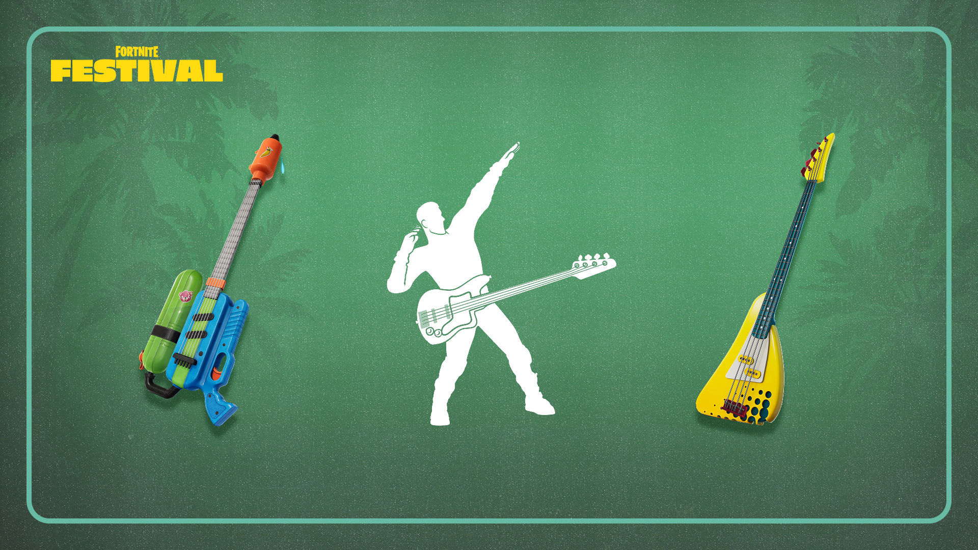 Jouez au lieu d'asperger tout le monde avec la guitare Éclabousseuse sonique. Faites briller vos talents de bassiste avec l'emote Engouement.Enfin, gardez la musique à flot avec la Basse pagaie.