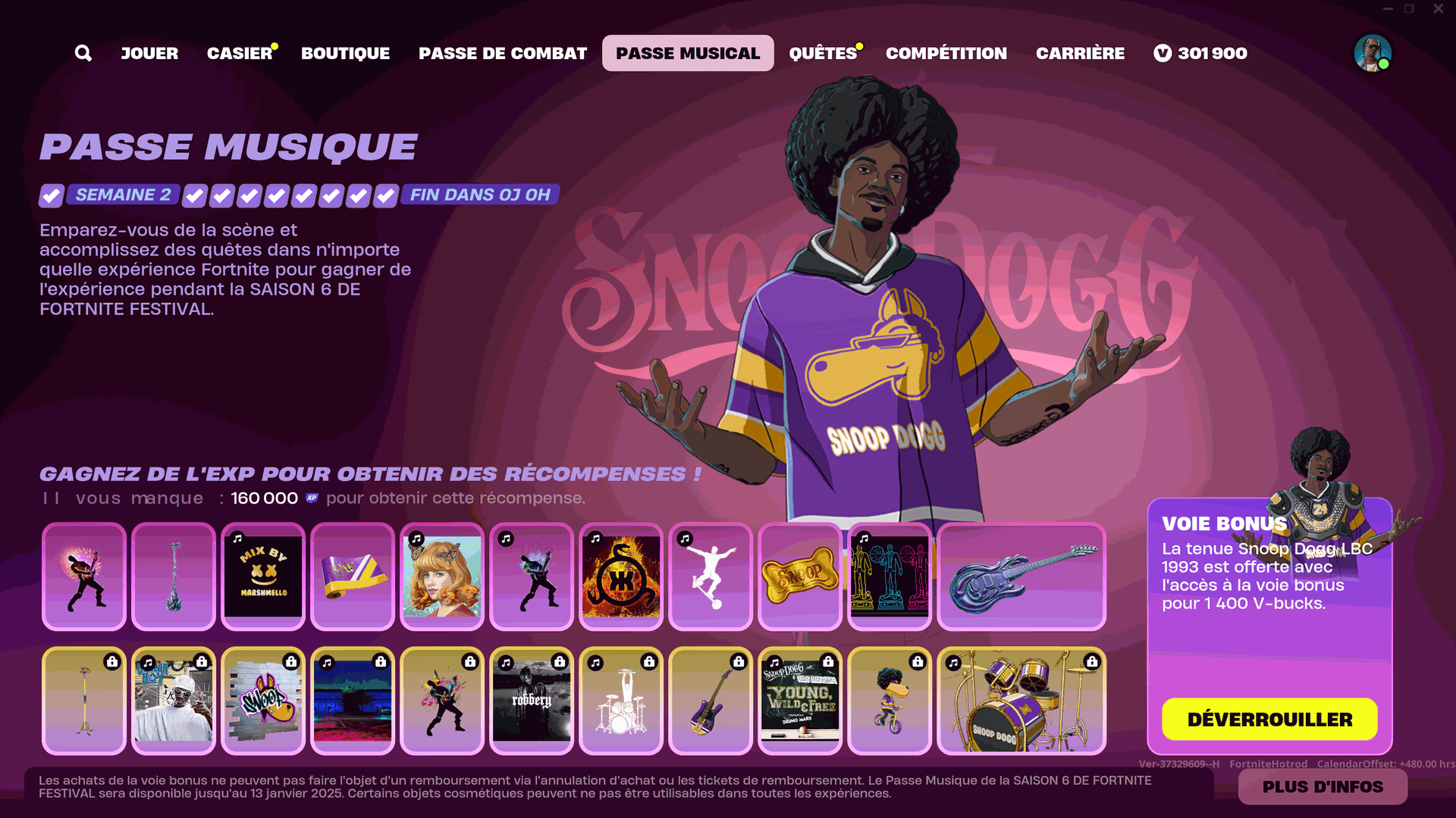 Soyez détendus avec les instruments Snoop Dogg et la tenue Snoop Dogg LBC 1993 du Passe Musique. Vous pouvez progresser dans le Passe Musique avec de l'EXP de n'importe quelle expérience Fortnite et pas seulement celle de Fortnite Festival. Ce qui vous donne l'occasion de déverrouiller des instruments, des auras et bien plus de récompenses de diverses manières pour les utiliser sur scène ! Consultez cet article de blog pour en savoir plus : Avancez en même temps dans vos Passes de Fortnite. Le Passe Musique dispose d'une voie gratuite et d'une voie bonus disponible pour 1 400 V-bucks.