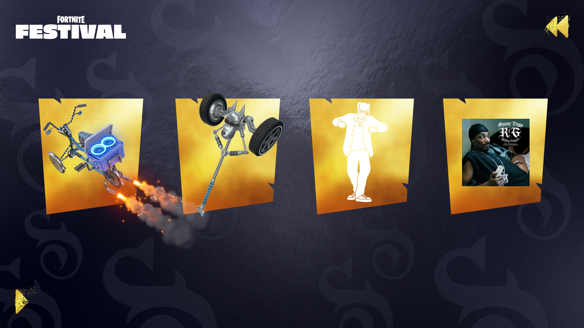 Récupérez le Passe Musique pour 1 400 V-bucks et accédez aux instruments de Snoop Dogg et aux autres récompenses déverrouillables ! Vous recevrez automatiquement la tenue Snoop Dogg LBC 1993 lorsque vous achetez le Passe Musique. Rapportez un peu de côte ouest sur la scène principale, la scène d'impro et la scène Royale. Ou lâchez le chien dans n'importe quelle autre expérience de Fortnite !