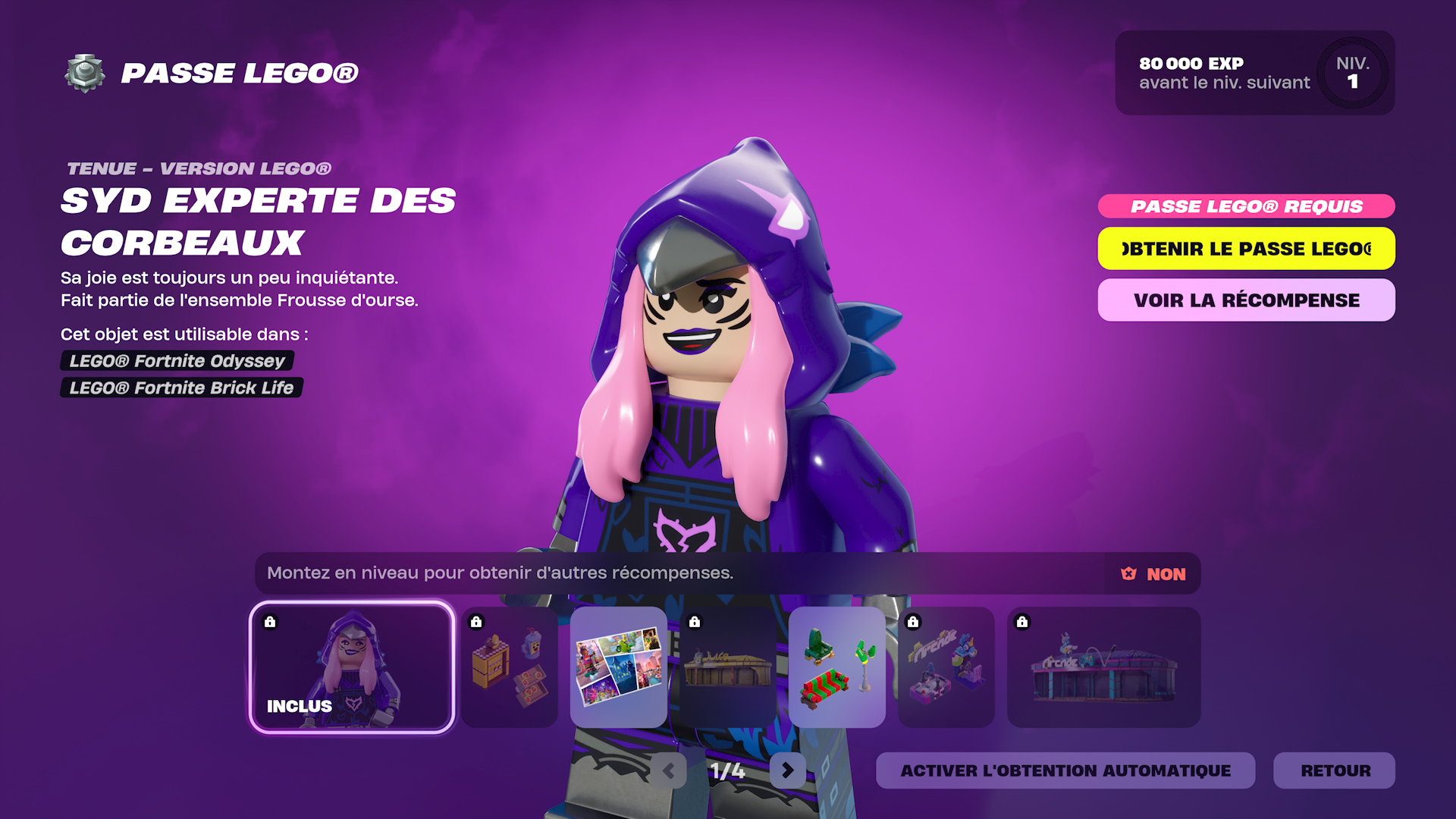 À noter ! Vous pourrez progresser dans le Passe LEGO Chair de poule jusqu'au 11 mars 2025 à 10h (CET). Ses récompenses gratuites, celles de la voie bonus et la tenue Syd experte des corbeaux ne sont pas exclusives au Passe. Ces objets pourraient devenir disponibles dans la boutique d'objets ou d'une autre façon à une date ultérieure.